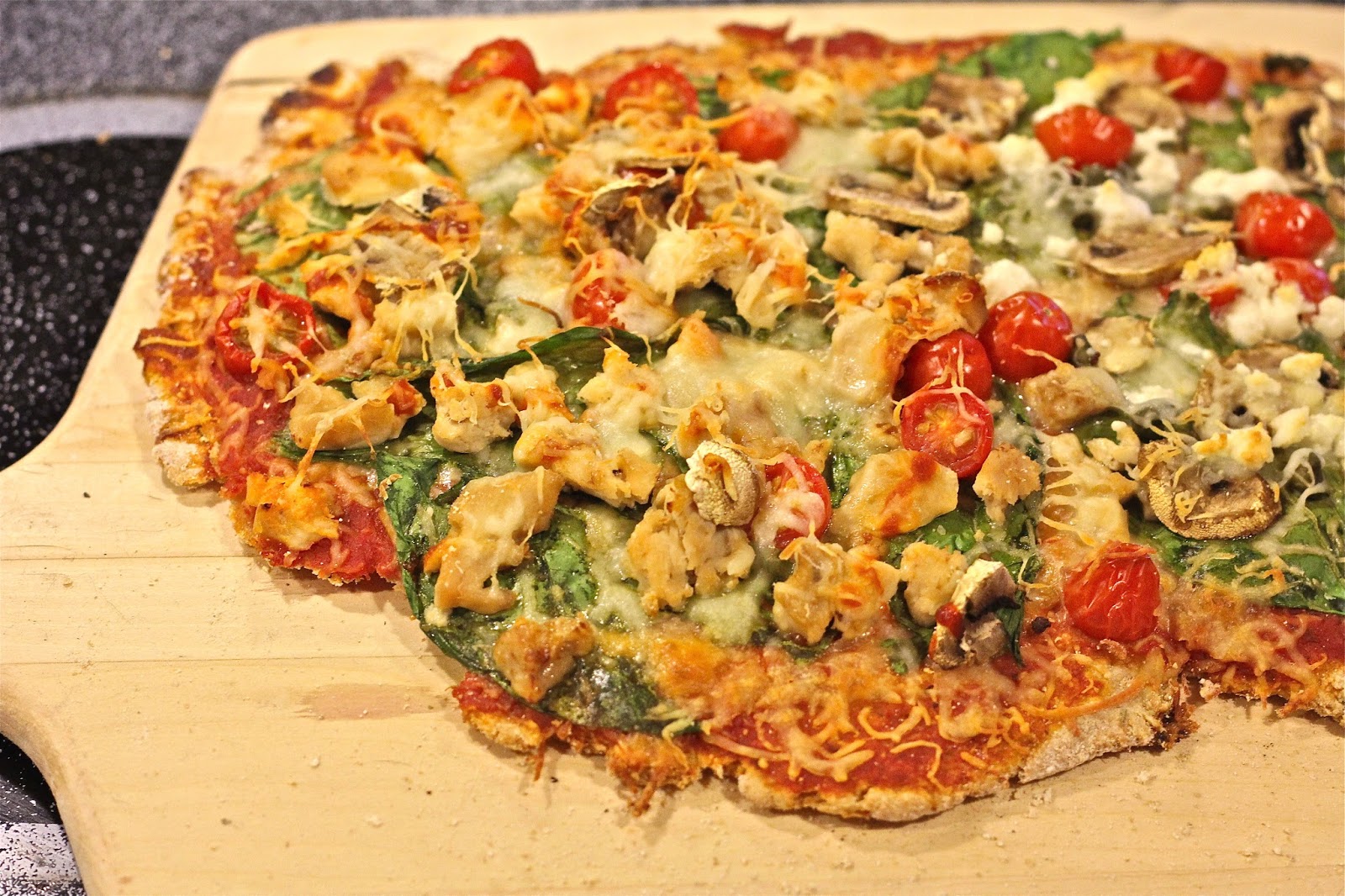 He had fresh spinach, cherry tomatoes, grilled chicken, mushrooms and mozzarella cheese with a drizzle of srirracha sauce.